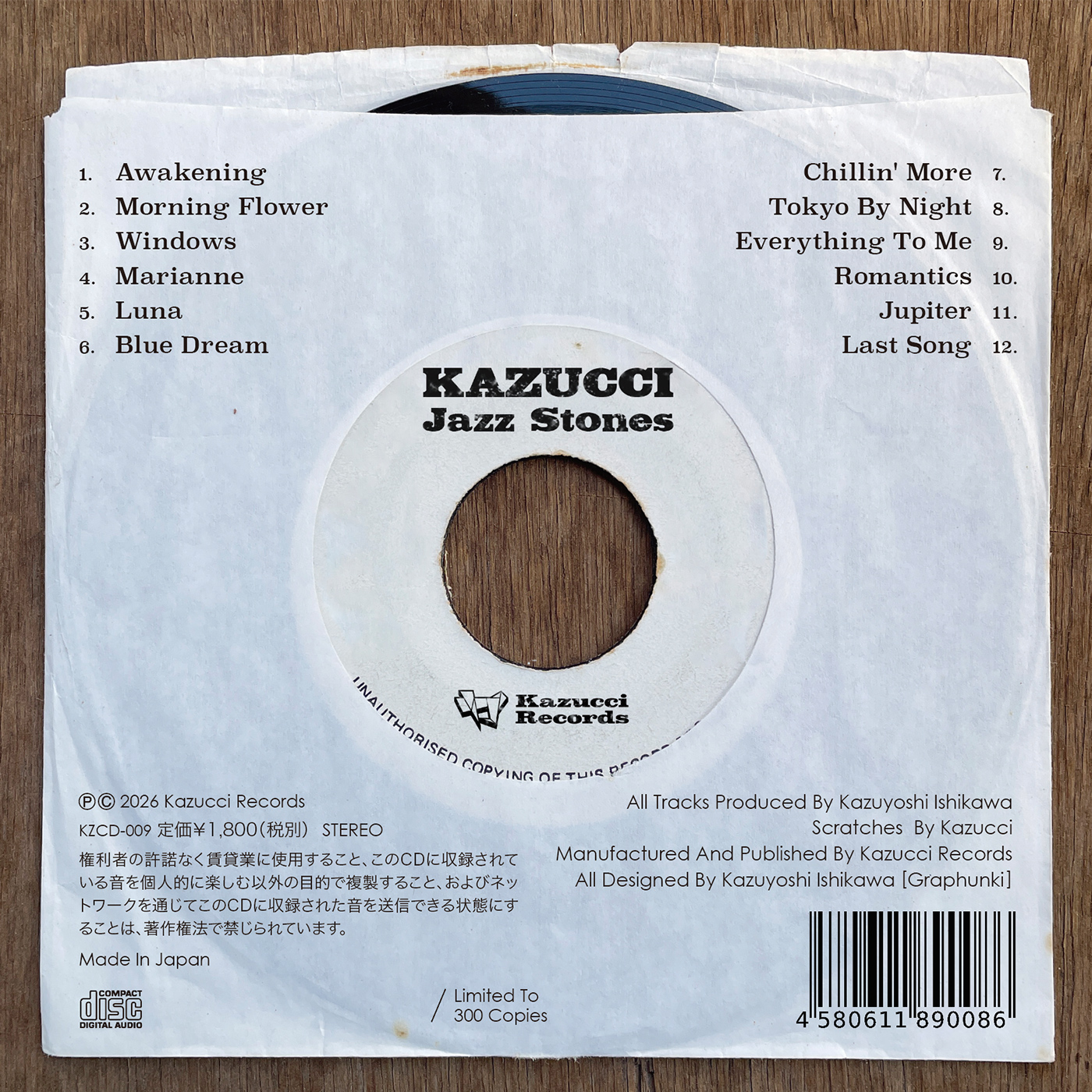 アートワークも自身による。300枚限定盤。直接メールをいただければ通信販売に対応いたしますのでお気軽にご連絡ください。